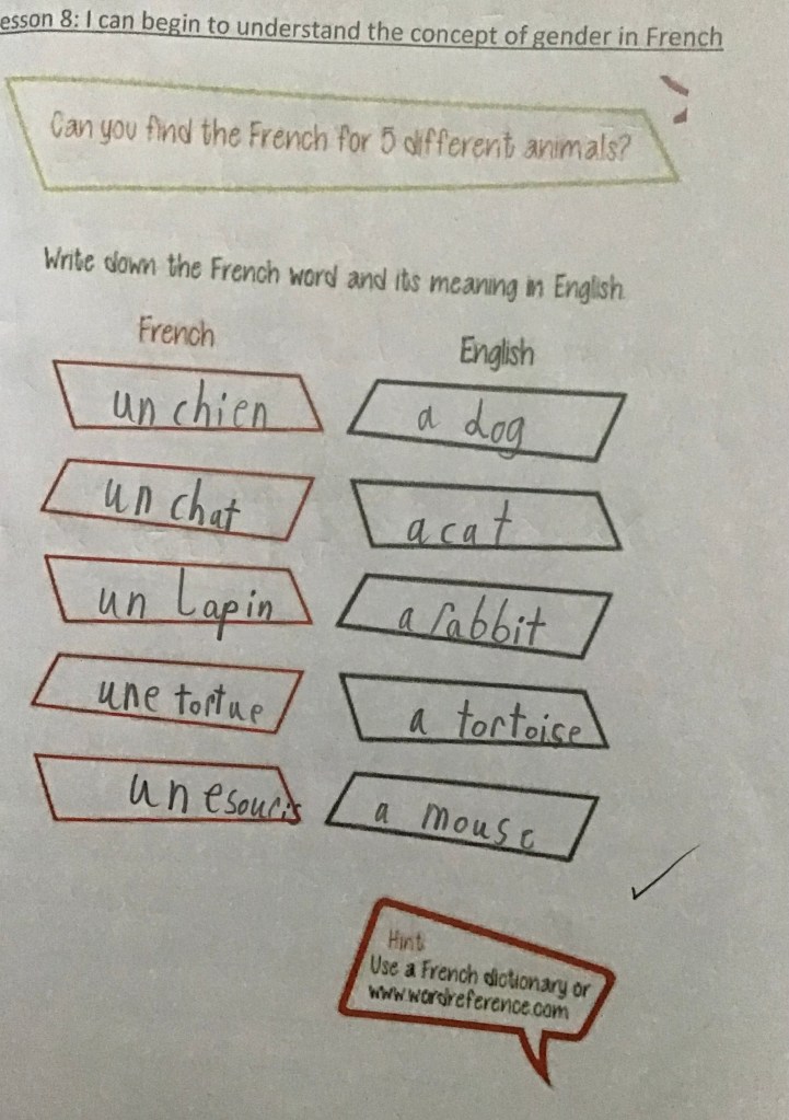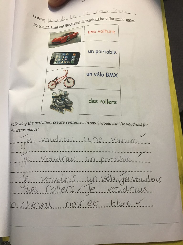 Translate phrases or simple sentences from French/Spanish to English and English to French/Spanish including the use of a dictionary or supporting resource.